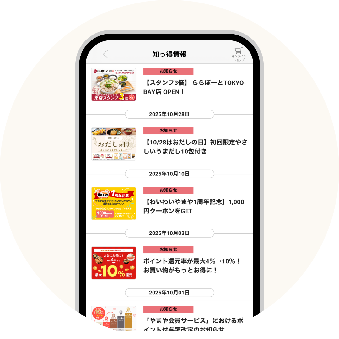来店スタンプを貯めて、美味しいやまや商品をもらおう!
