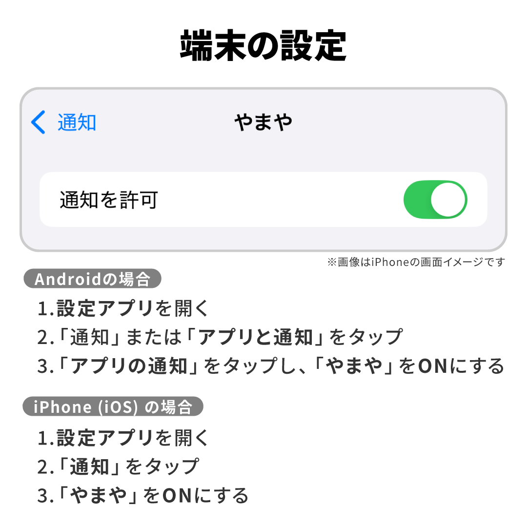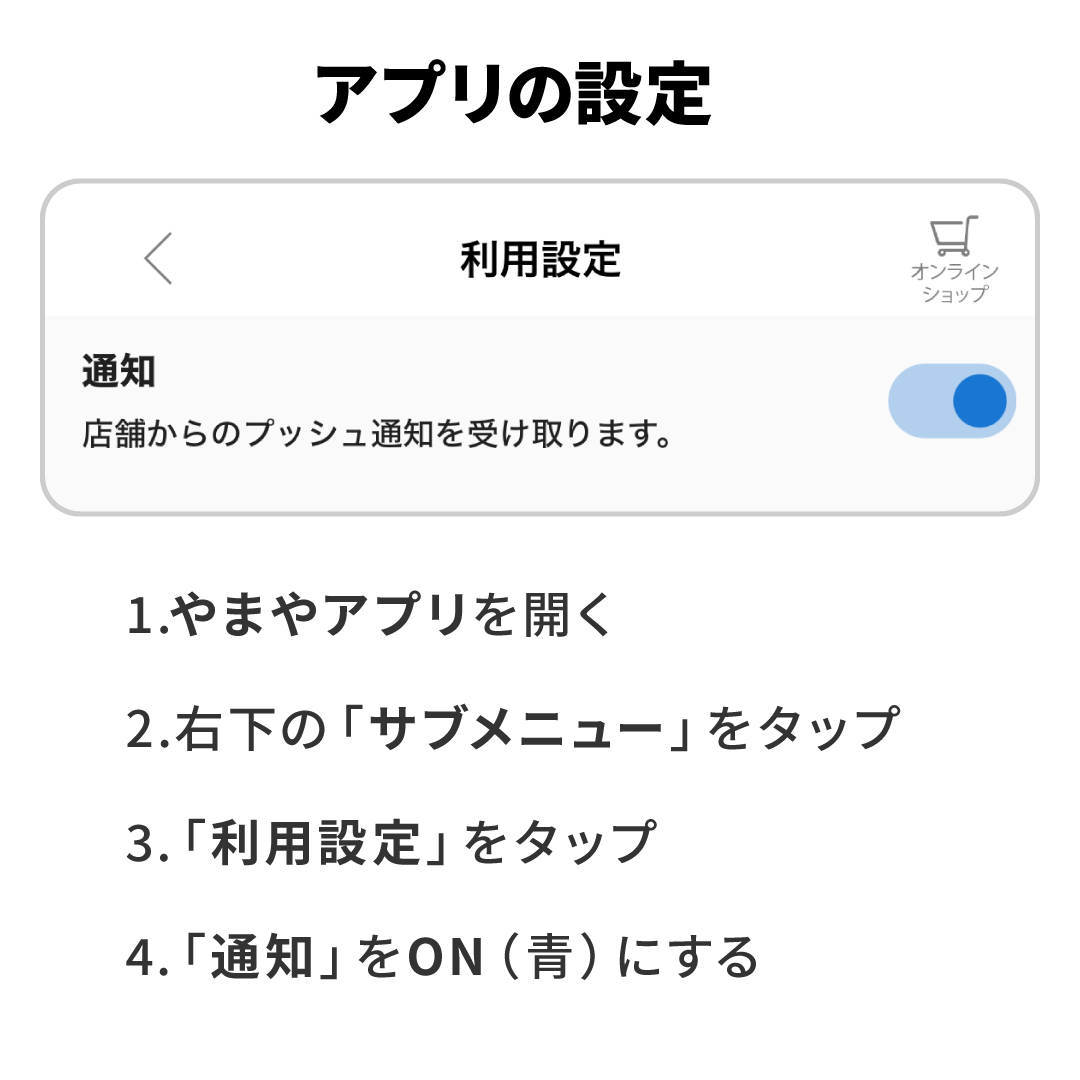 アプリだけの特別なクーポンや、お得なお知らせを受け取るには端末/アプリともに通知設定を「ON」にご設定ください。