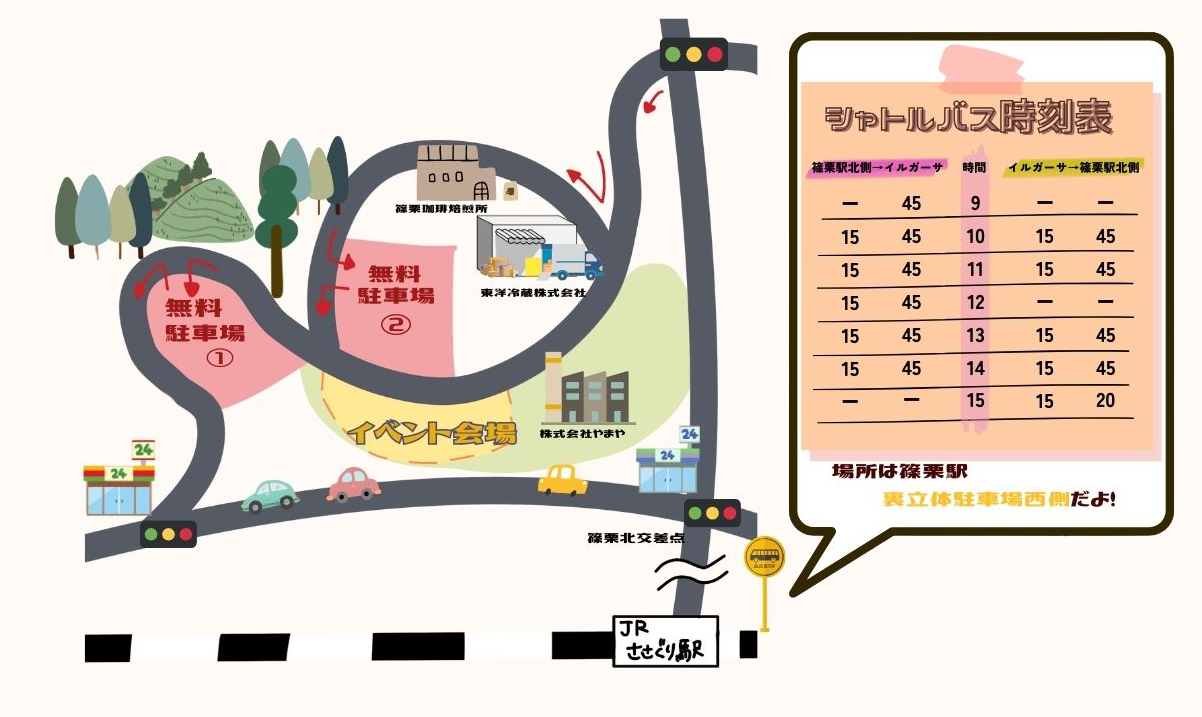 お車でお越しの際はチラシに記載の無料駐車場をご利用いただけますが、駐車場が狭いためシャトルバスをぜひご利用ください。