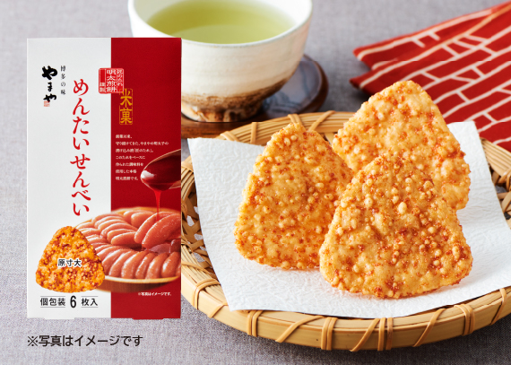 めんたいせんべいは、創業以来、継ぎ足しながら守り続ける明太子の漬け込み液「匠のたれ」をベースに味付けした、ピリッと辛い本格派の明太煎餅です。お米の素材感を残し、パリッと香ばしく焼き上げました。