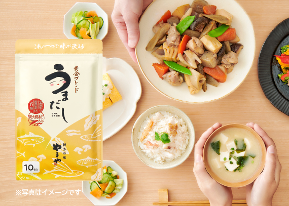 うまだしは、うまだしは、6種類の厳選だし素材を、黄金比率でブレンドした万能だしパックです。煮出せば本格だしに、破って中身をそのまま調味料としても使える、一家に一つあると心強い万能アイテムです。