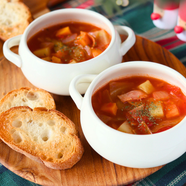 ベーコンのうま味、トマトの酸味と野菜の甘みが、うまだしのコクでひとつにまとまる具だくさんミネストローネ♪うまだしの粉末を加えることで塩分控えめでも深い味わいに仕上がり、家族で囲むクリスマスの食卓にぴったりです。
