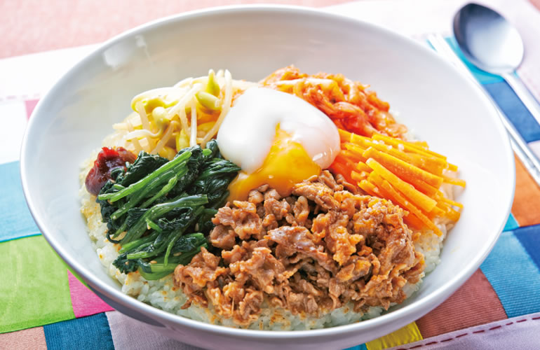 5.牛肉、ホウレンソウ、豆もやし、人参、キムチを彩り良く盛り、温泉卵を中央に乗せ、