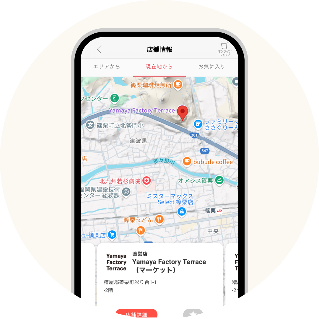アプリの位置情報をONすると、「店舗情報」のマップからお近くの店舗を検索することが可能です。