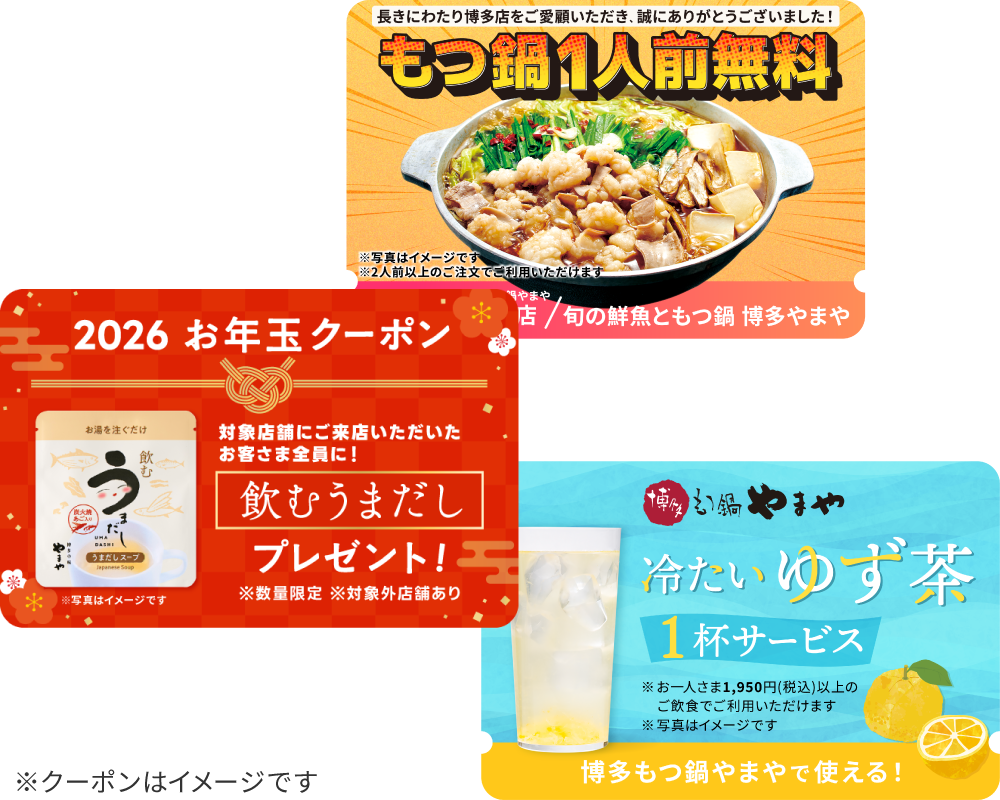 ※博多もつ鍋やまや一部店舗(大阪北浜店、エキマルシェ大阪店、京阪京橋店、JR三ノ宮店、大阪あべの店)は対象外です。